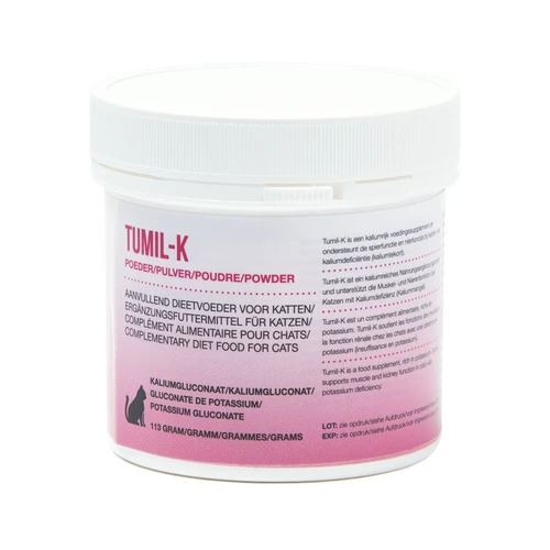 Tumil-K ist ein ergänzendes Diätfutter für Katzen mit chronischem Nierenversagen oder anderen Störungen, die einen niedrigen Kaliumspiegel im Blut zur Folge haben. Bei dieser Ergänzung handelt es sich um ein kaliumhaltiges Produkt in Pulverform. Tumil-K ist auf der Basis von schmackhaften Proteinen hergestellt und wird daher gut von Katzen angenommen.