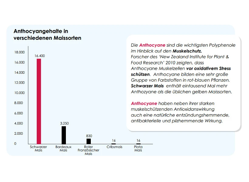 - Angereichert mit schwarzem Mais, eine sehr reiche Quelle an Antioxidantien, die für den Muskelschutz, weniger Muskelzellschädigungen und mehr Ausdauer verantwortlich sind.